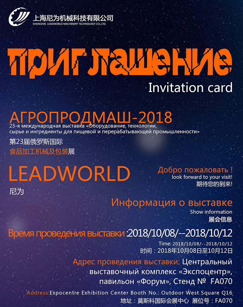 上海尼為機械科技有限公司誠意邀請您參觀將于2018年第23屆俄羅斯國際食品加工機械及包裝展-AGROPRODMASH
